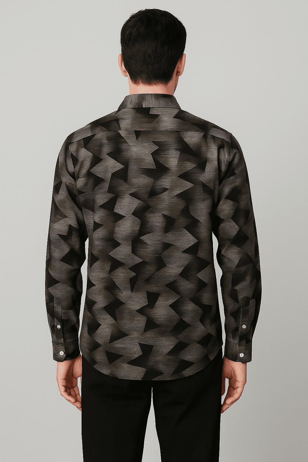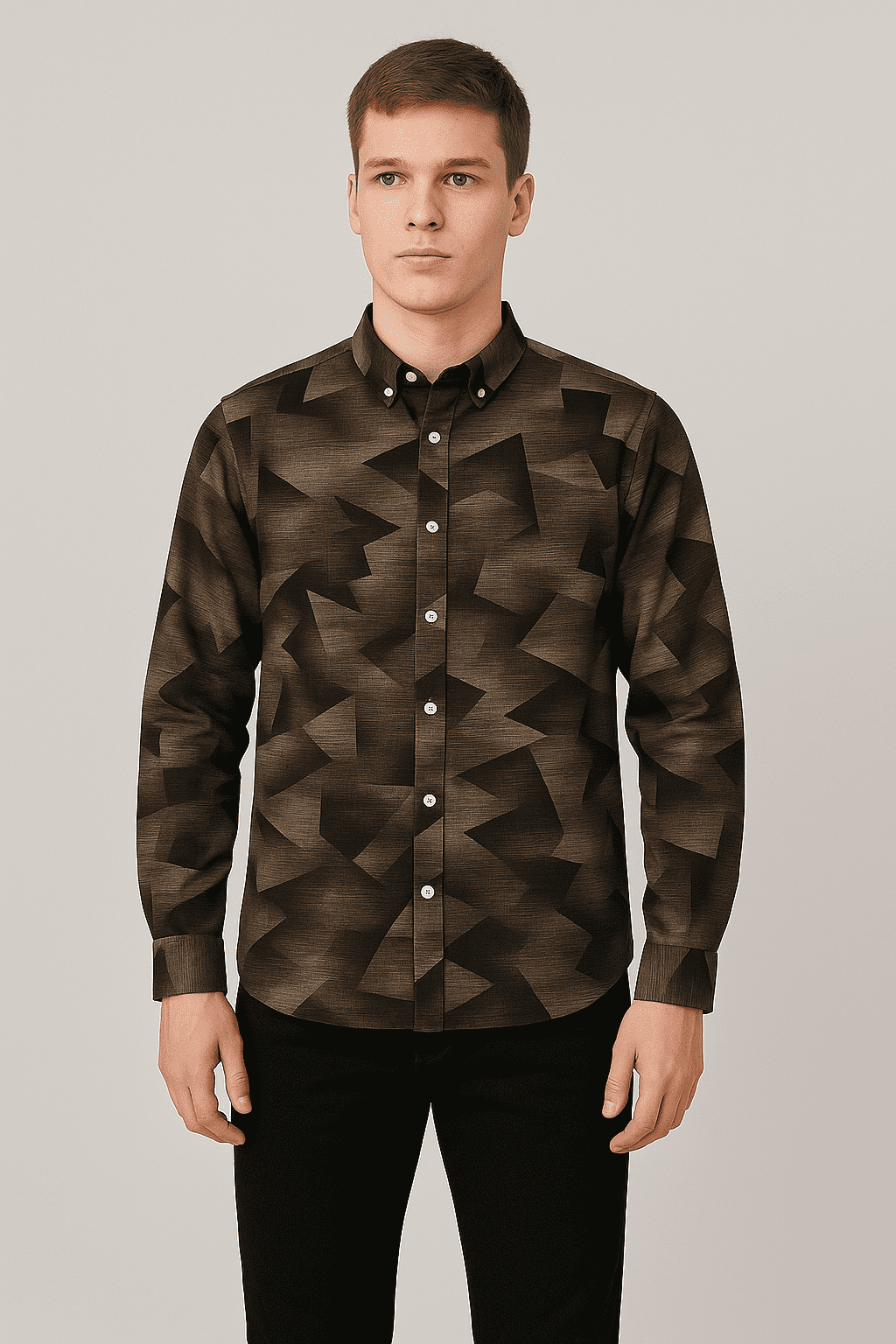 A brown & black mix button-down with full sleeves, featuring a abstract pattern and styled with brushed zigzag pattern with black and brown tones.