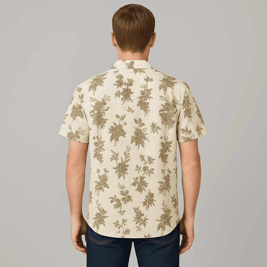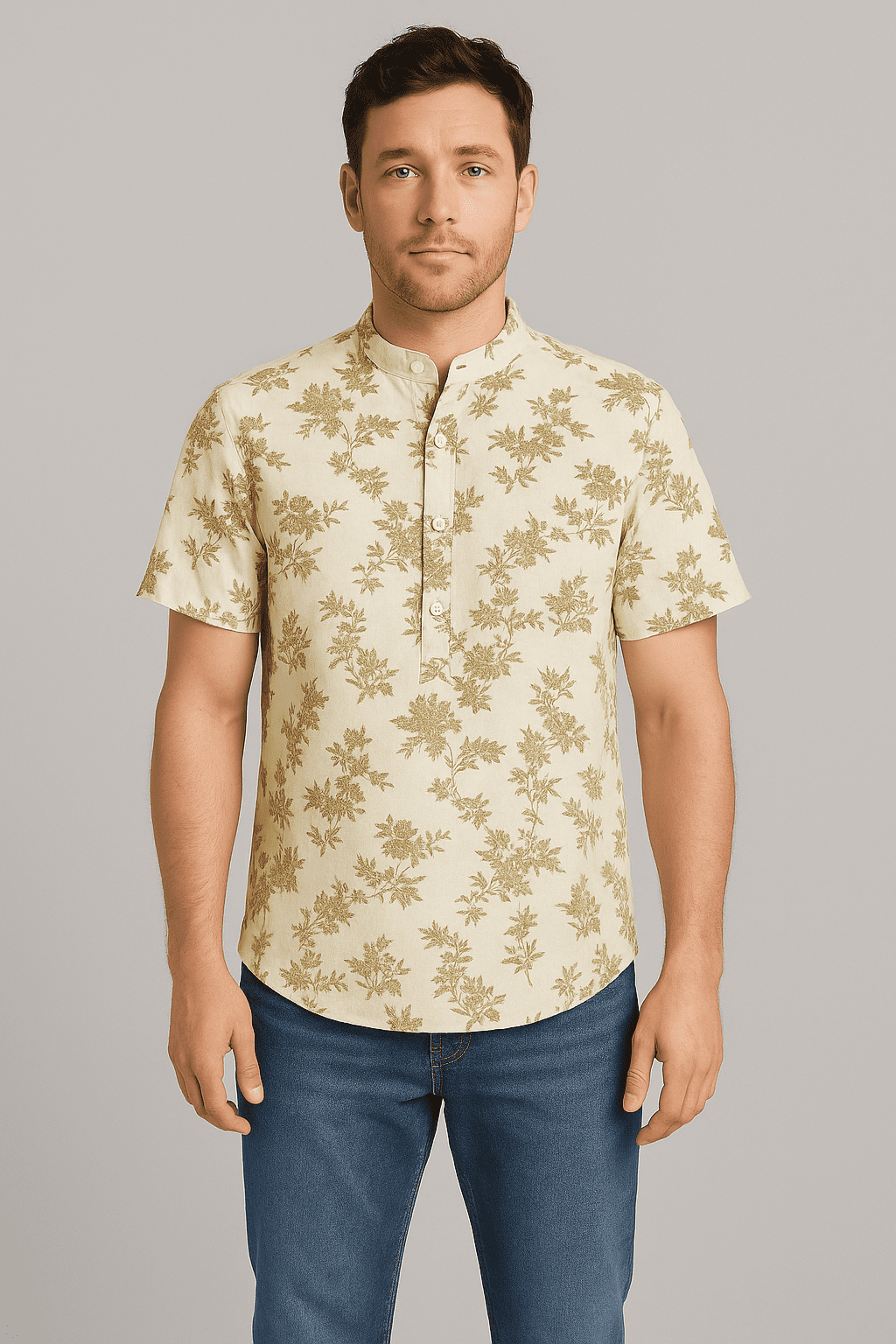 A cream mandarin collar half placket with short sleeves, featuring a floral pattern and styled with olive floral print.