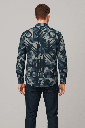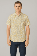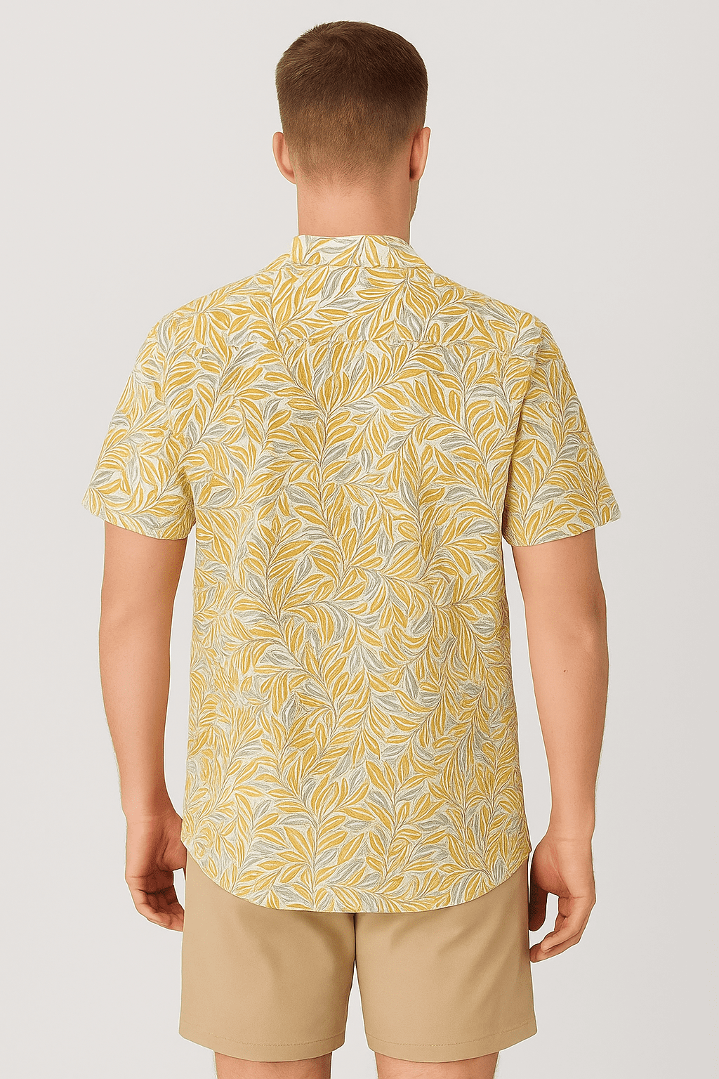 A cream casual button-up with short sleeves, featuring a leaf all-over pattern and styled with yellow/green leaves.