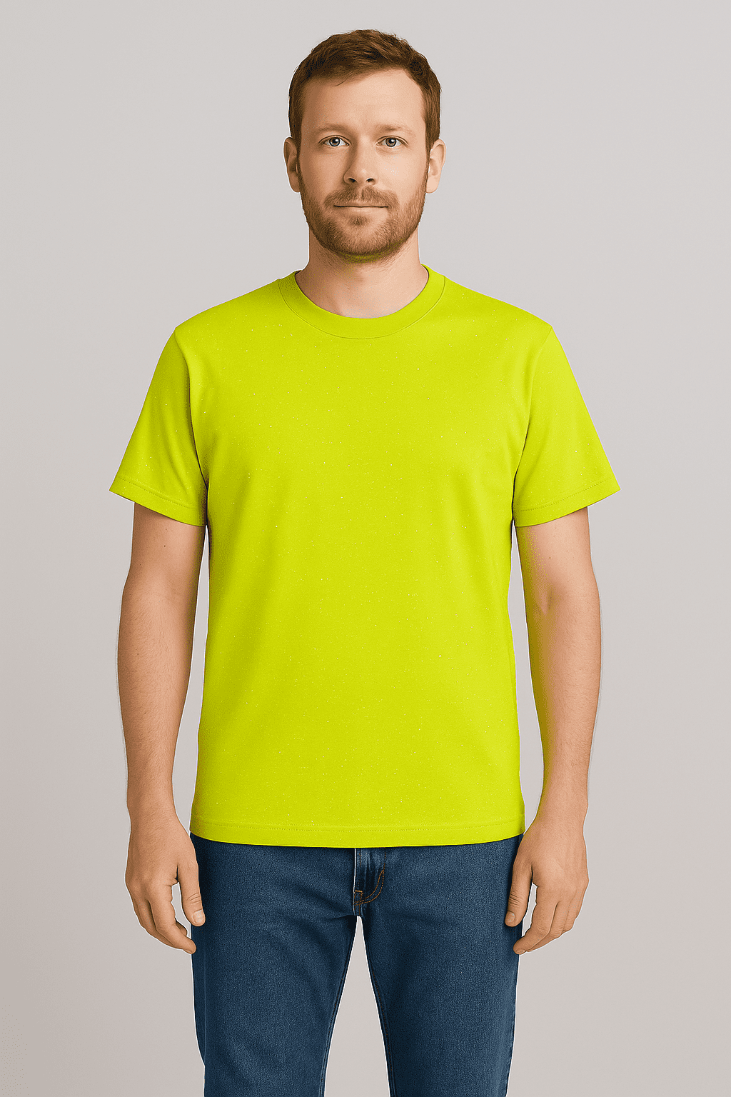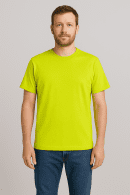 A green t-shirt with short sleeve sleeves, featuring a graphic or patterned print pattern and styled with casual or statement piece.