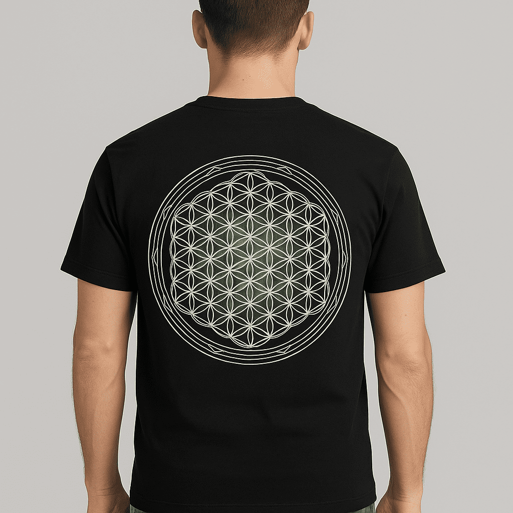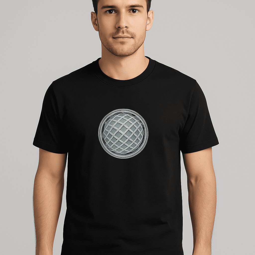 Circular illusion graphic centered on a black base. A bold pick for fans of modern, abstract fashion.
