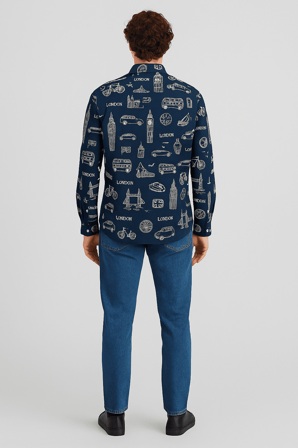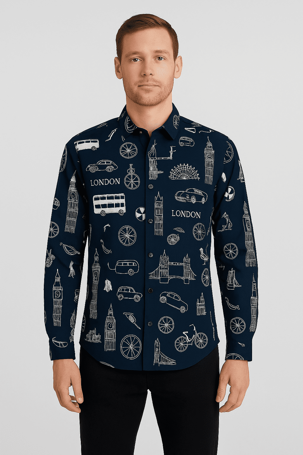 A navy blue button-up shirt with long sleeve sleeves, featuring a white london motifs pattern and styled with british themed.