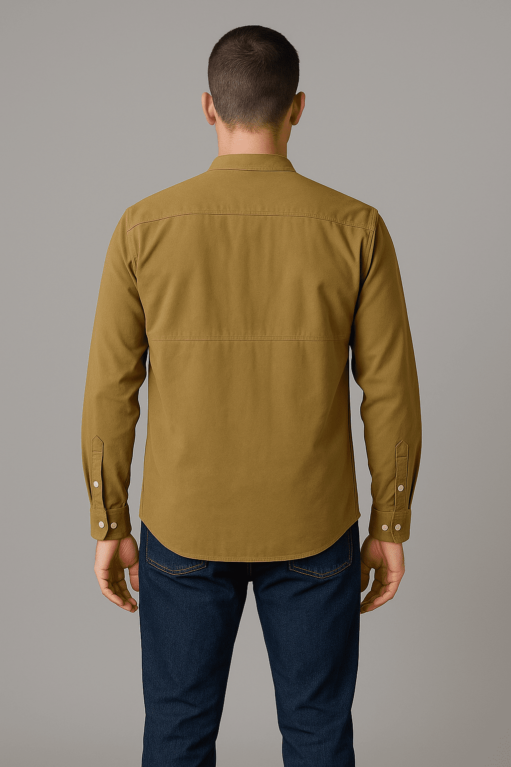 A mustard mandarin collar with full sleeves, featuring a solid pattern and styled with plain mustard shirt with front pocket and mandarin collar.