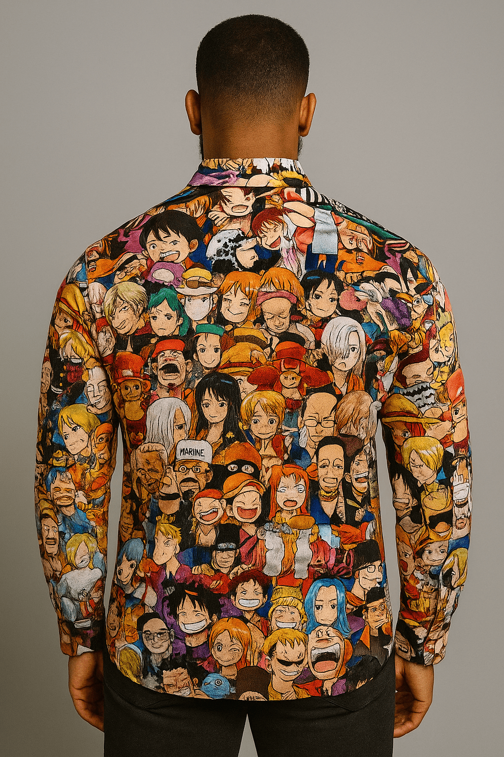 Features front-facing One Piece characters from the anime in a tight collage format on a button-up.