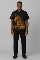 A multicolor button-up shirt with short sleeve sleeves, featuring a graphic or patterned print pattern and styled with casual or statement piece.