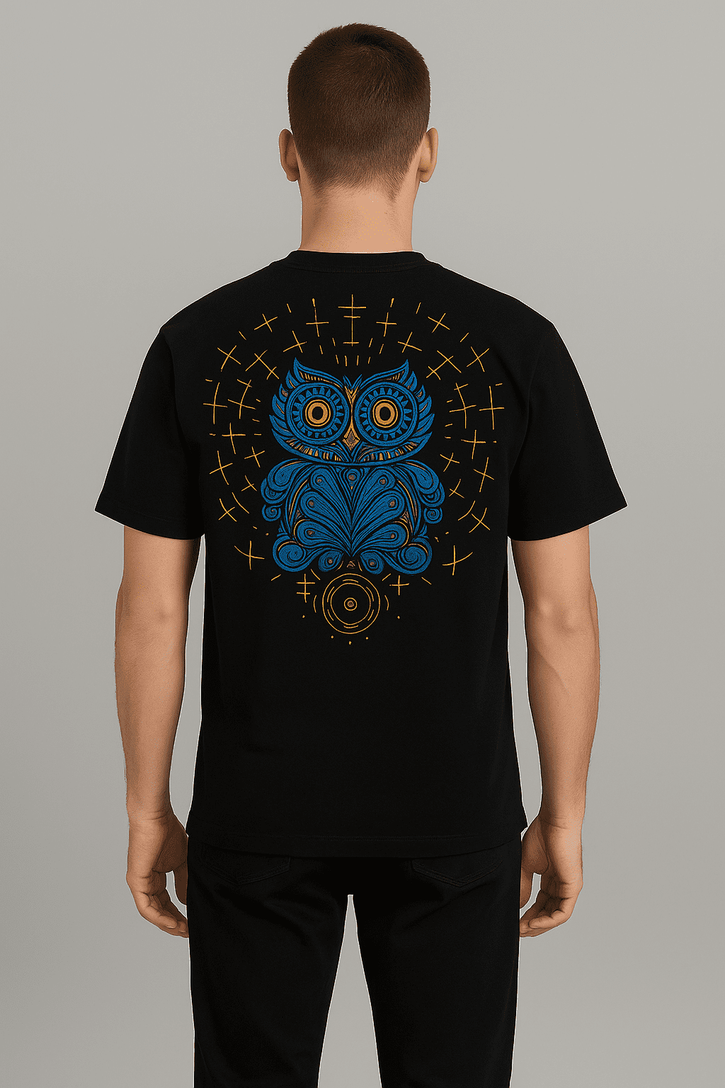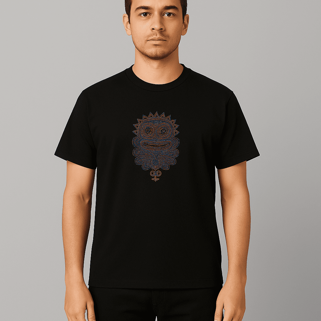 A black crew neck t-shirt with short sleeves, featuring a graphic pattern and styled with tribal face design (red/blue).