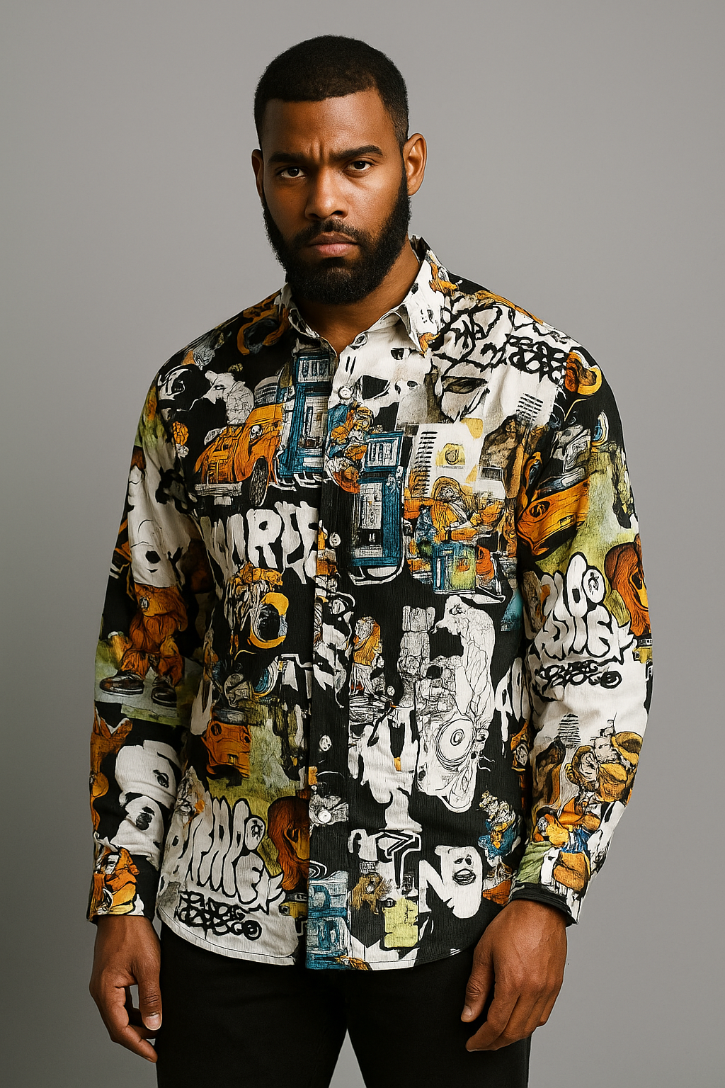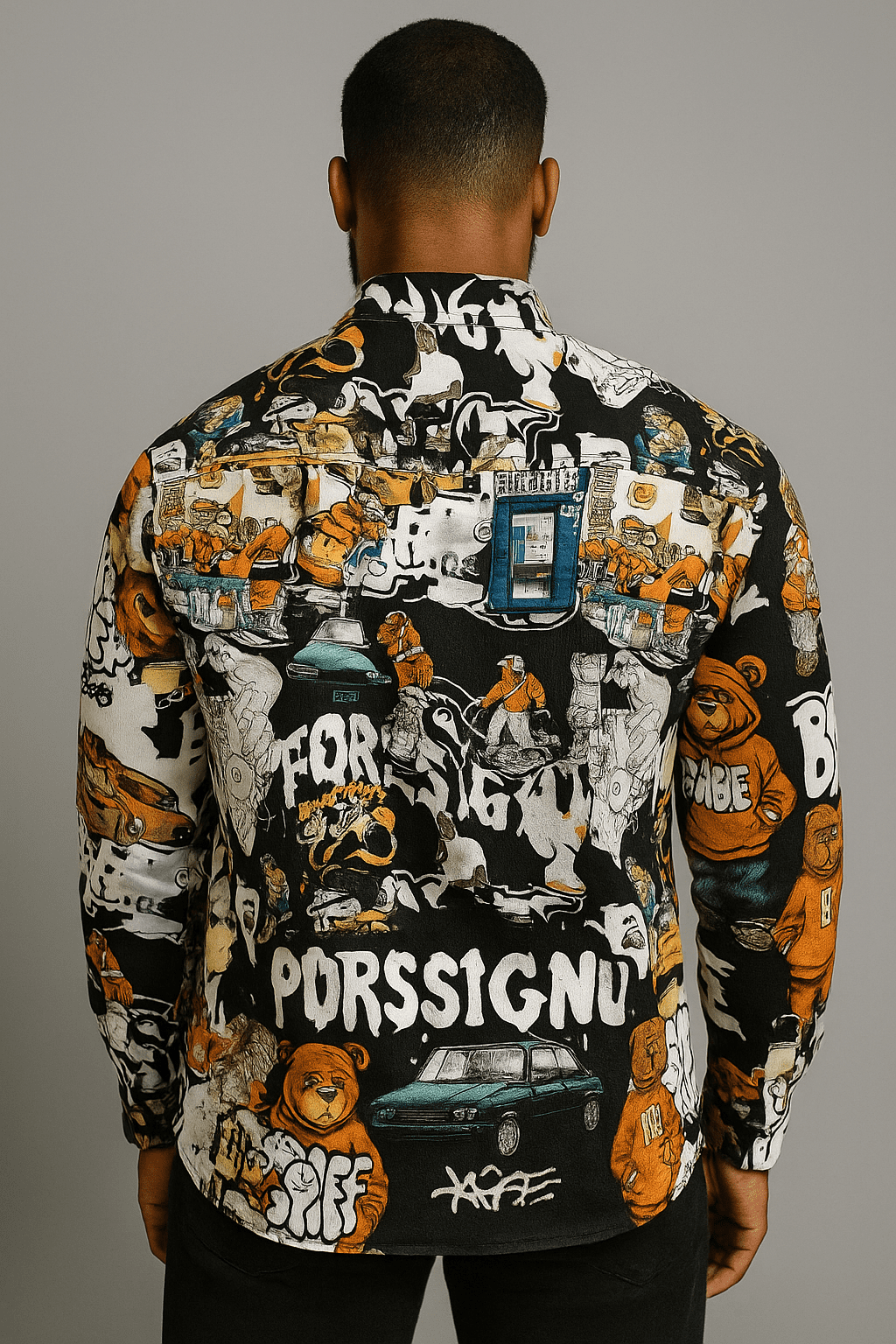 Multicolor long-sleeve button-up with bold comic and graffiti mashups. Features cars, cartoon bears, and street motifs.