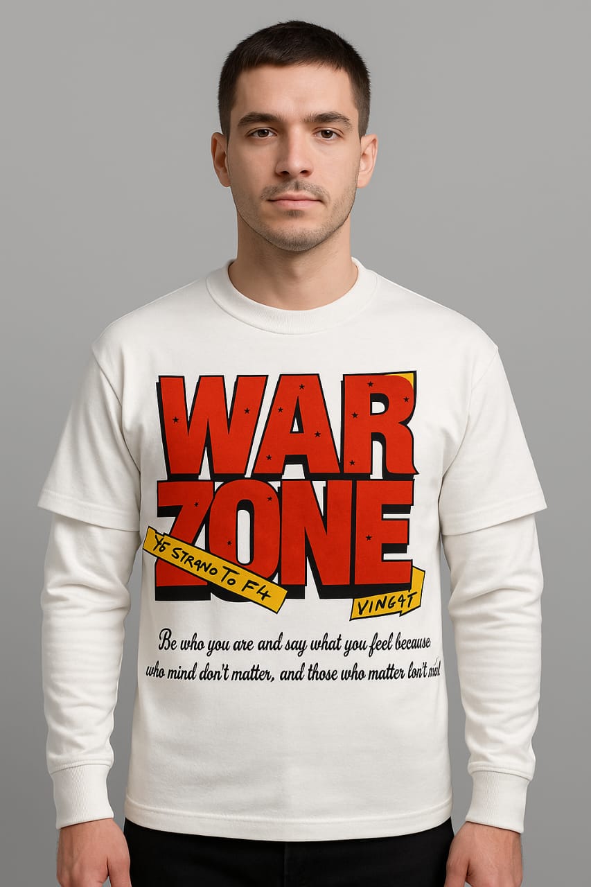 White graphic tee with bold red “WAR ZONE” text and quote.