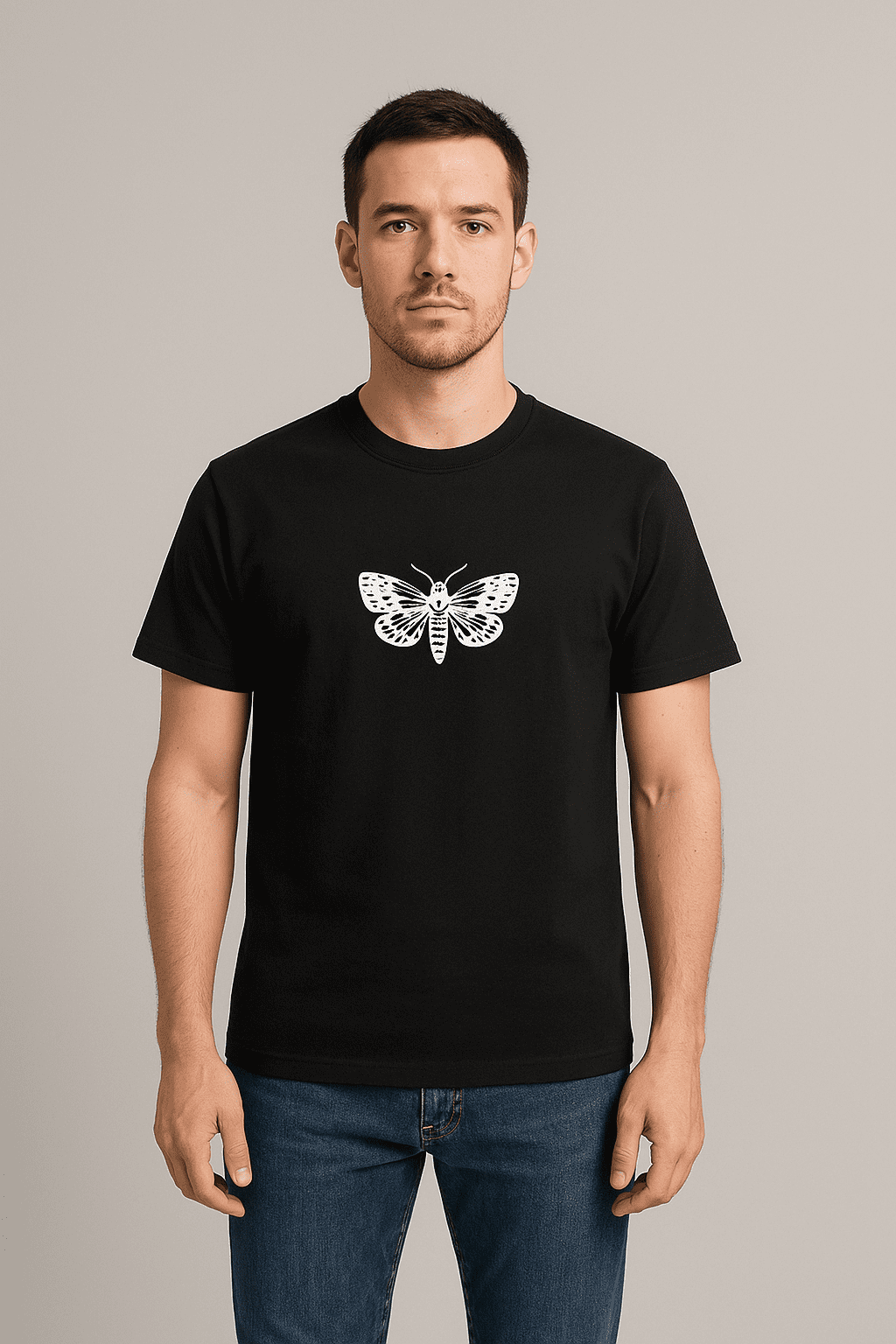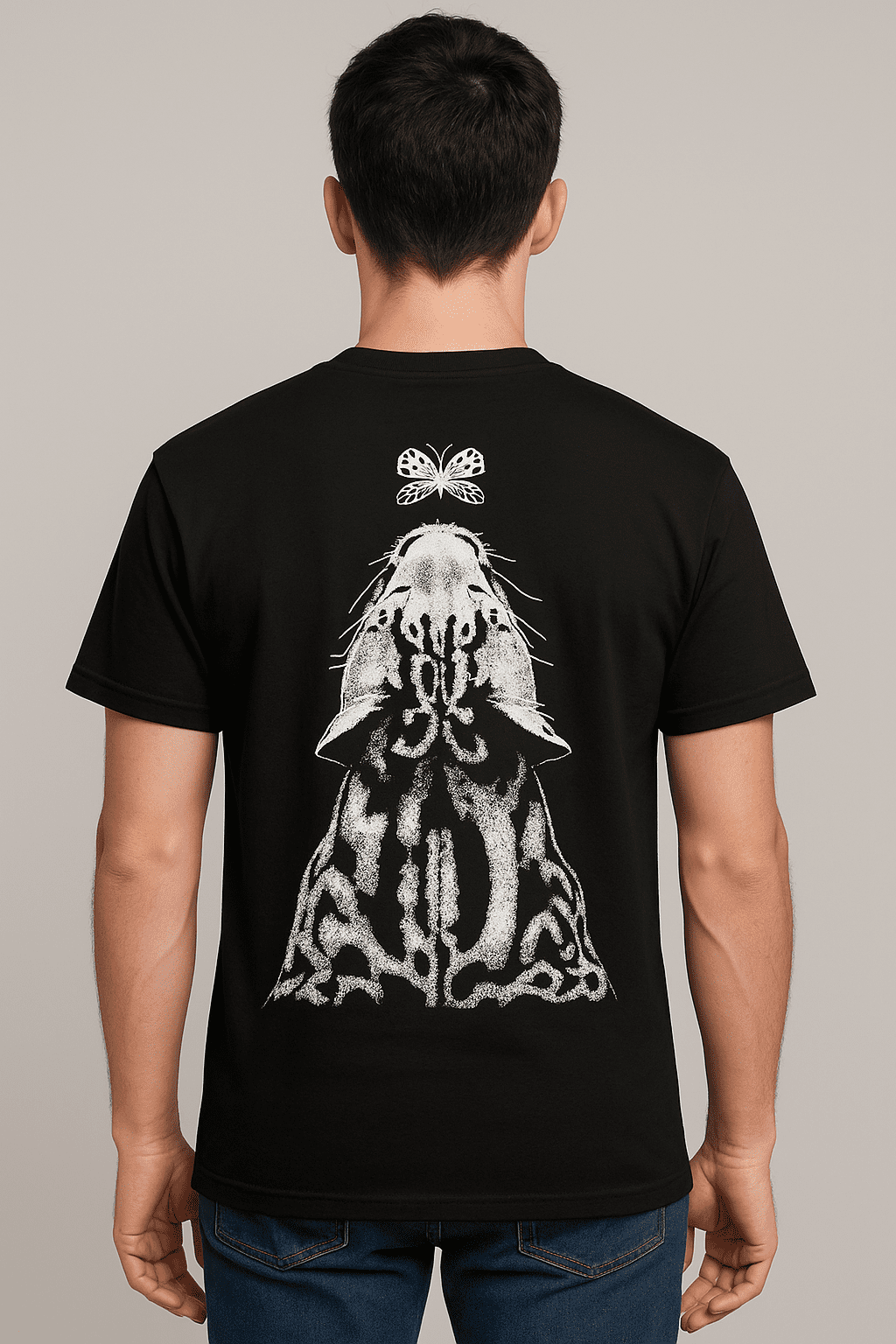 Unique back print showing a leopard staring up at a moth. Symbolic design with a calm but intense presence.